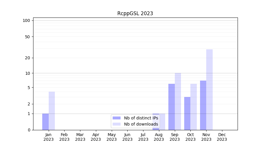 Number of downloads for workflow package RcppGSL, year by year, from 2025 back to 2015 (years with no downloads are omitted):