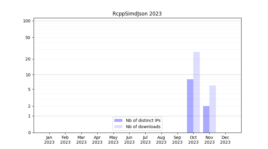 Number of downloads for workflow package RcppSimdJson, year by year, from 2025 back to 2015 (years with no downloads are omitted):