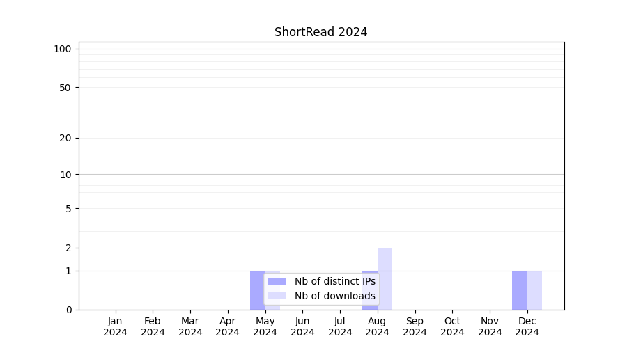 Number of downloads for workflow package ShortRead, year by year, from 2025 back to 2015 (years with no downloads are omitted):