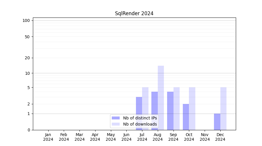 Number of downloads for workflow package SqlRender, year by year, from 2025 back to 2015 (years with no downloads are omitted):