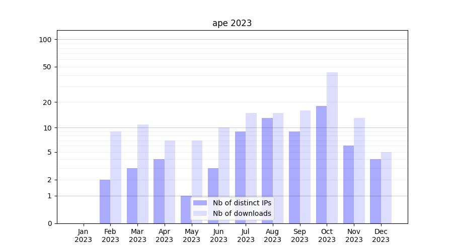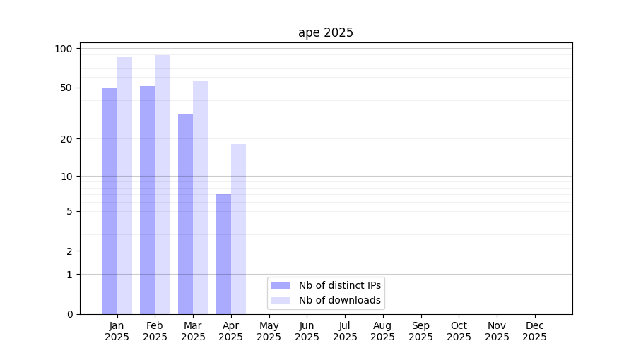 Number of downloads for workflow package ape, year by year, from 2025 back to 2015 (years with no downloads are omitted):