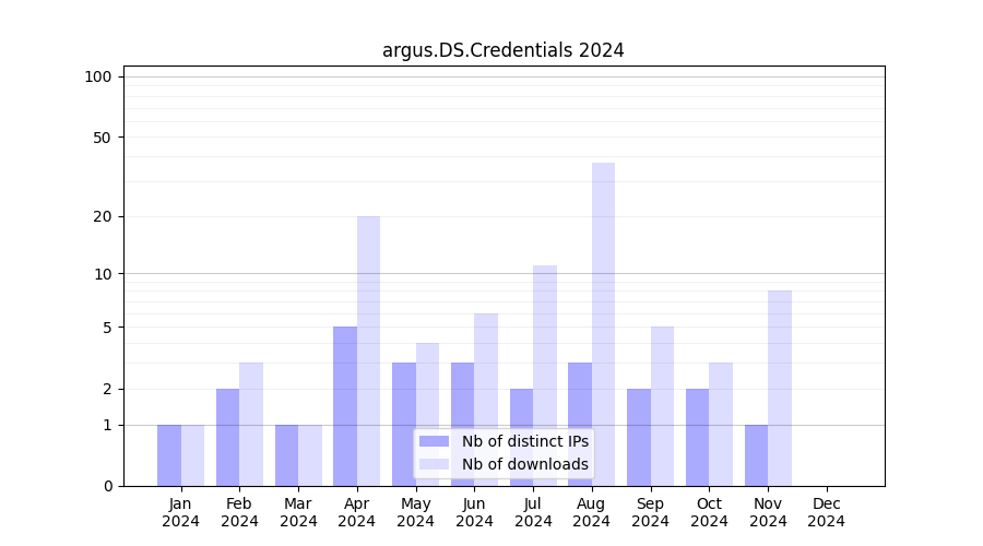 Number of downloads for workflow package argus.DS.Credentials, year by year, from 2025 back to 2015 (years with no downloads are omitted):