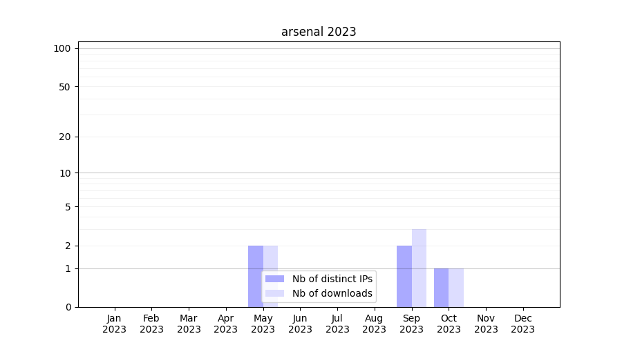 Number of downloads for workflow package arsenal, year by year, from 2025 back to 2015 (years with no downloads are omitted):