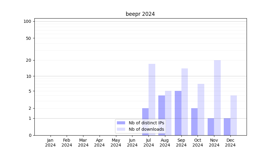 Number of downloads for workflow package beepr, year by year, from 2025 back to 2015 (years with no downloads are omitted):