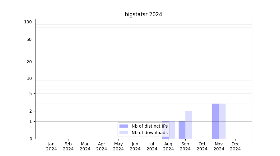 Number of downloads for workflow package bigstatsr, year by year, from 2025 back to 2015 (years with no downloads are omitted):