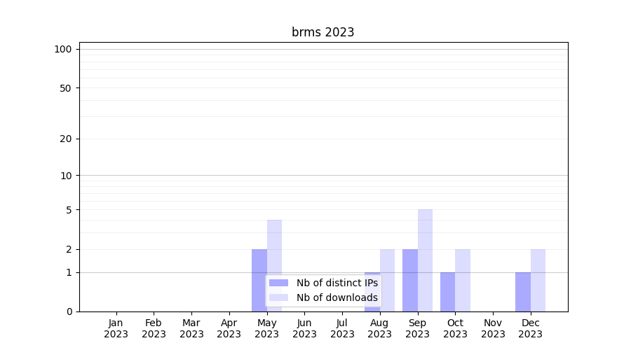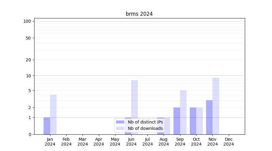 Number of downloads for workflow package brms, year by year, from 2025 back to 2015 (years with no downloads are omitted):