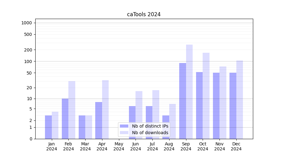 Number of downloads for workflow package caTools, year by year, from 2025 back to 2015 (years with no downloads are omitted):