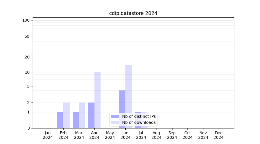Number of downloads for workflow package cdip.datastore, year by year, from 2025 back to 2015 (years with no downloads are omitted):