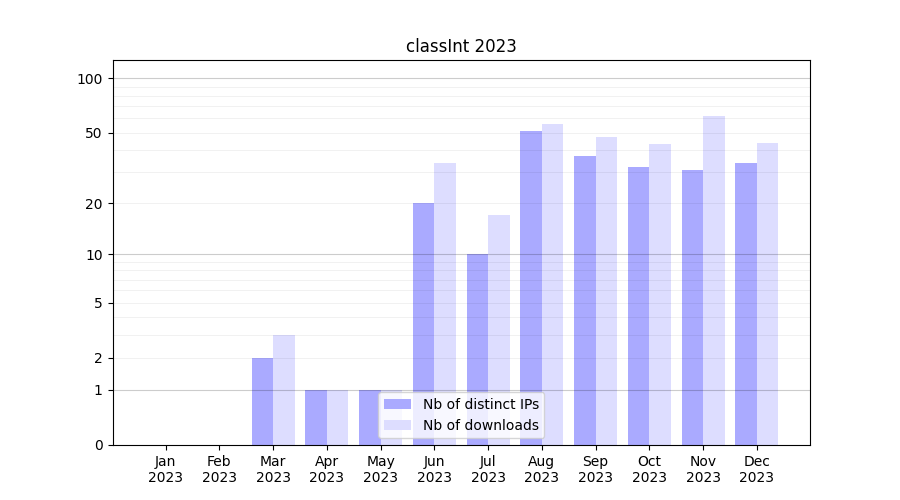 Number of downloads for workflow package classInt, year by year, from 2025 back to 2015 (years with no downloads are omitted):