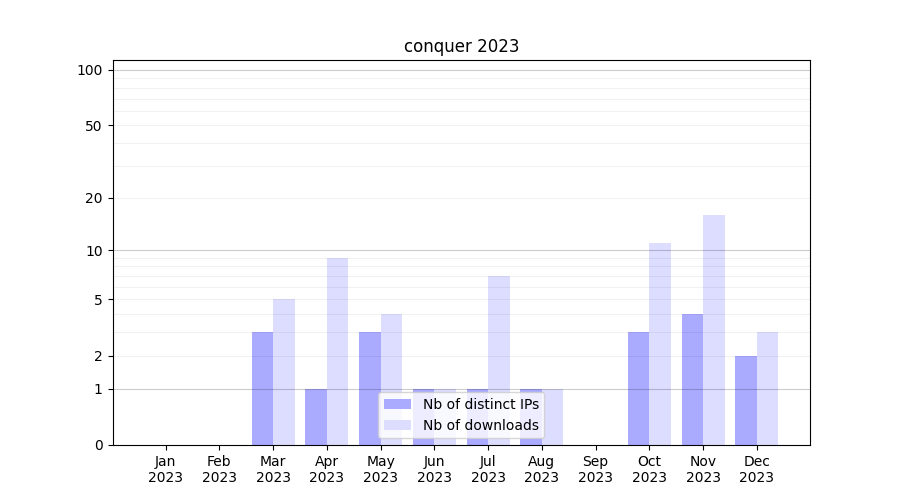 Number of downloads for workflow package conquer, year by year, from 2025 back to 2015 (years with no downloads are omitted):
