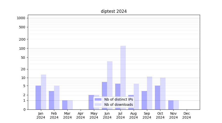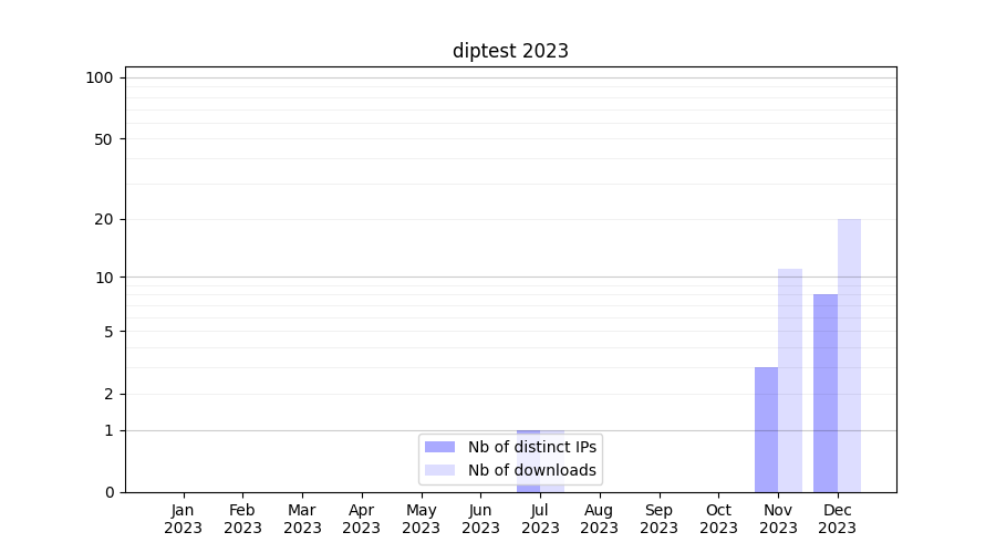 Number of downloads for workflow package diptest, year by year, from 2025 back to 2015 (years with no downloads are omitted):