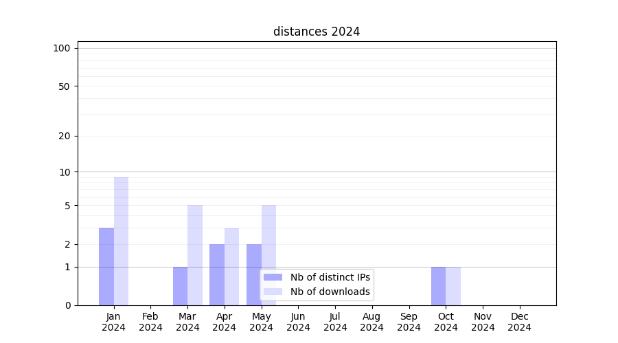 Number of downloads for workflow package distances, year by year, from 2025 back to 2015 (years with no downloads are omitted):