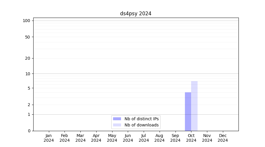 Number of downloads for workflow package ds4psy, year by year, from 2025 back to 2015 (years with no downloads are omitted):