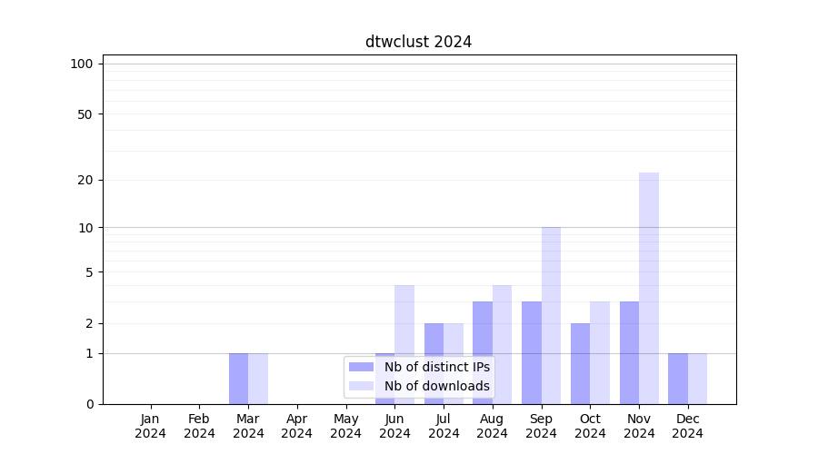 Number of downloads for workflow package dtwclust, year by year, from 2025 back to 2015 (years with no downloads are omitted):