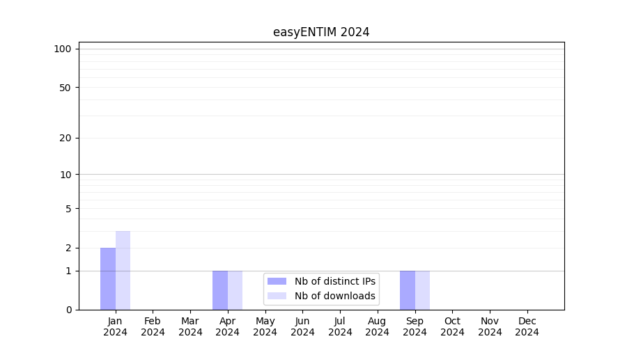 Number of downloads for workflow package easyENTIM, year by year, from 2025 back to 2015 (years with no downloads are omitted):