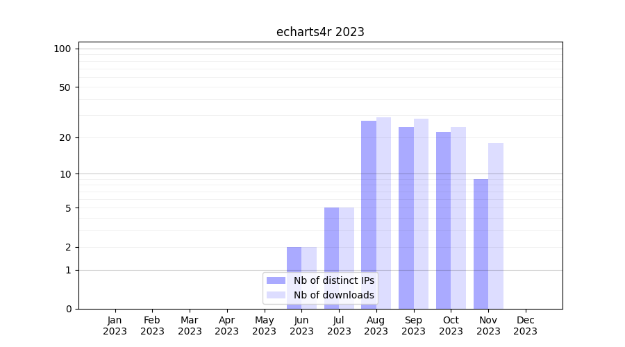 Number of downloads for workflow package echarts4r, year by year, from 2025 back to 2015 (years with no downloads are omitted):