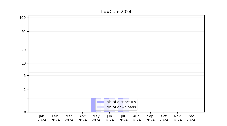 Number of downloads for workflow package flowCore, year by year, from 2025 back to 2015 (years with no downloads are omitted):