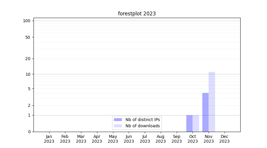 Number of downloads for workflow package forestplot, year by year, from 2025 back to 2015 (years with no downloads are omitted):