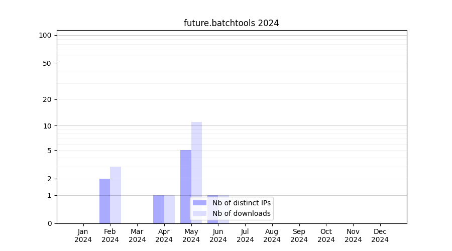 Number of downloads for workflow package future.batchtools, year by year, from 2025 back to 2015 (years with no downloads are omitted):
