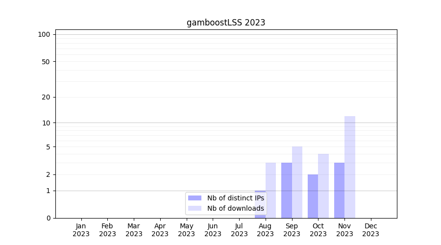 Number of downloads for workflow package gamboostLSS, year by year, from 2025 back to 2015 (years with no downloads are omitted):