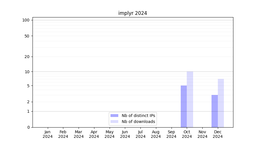 Number of downloads for workflow package implyr, year by year, from 2025 back to 2015 (years with no downloads are omitted):