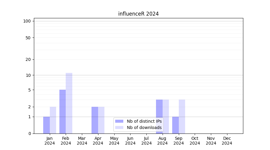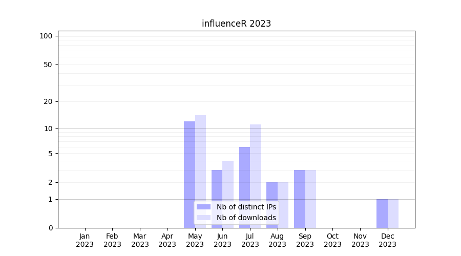 Number of downloads for workflow package influenceR, year by year, from 2025 back to 2015 (years with no downloads are omitted):