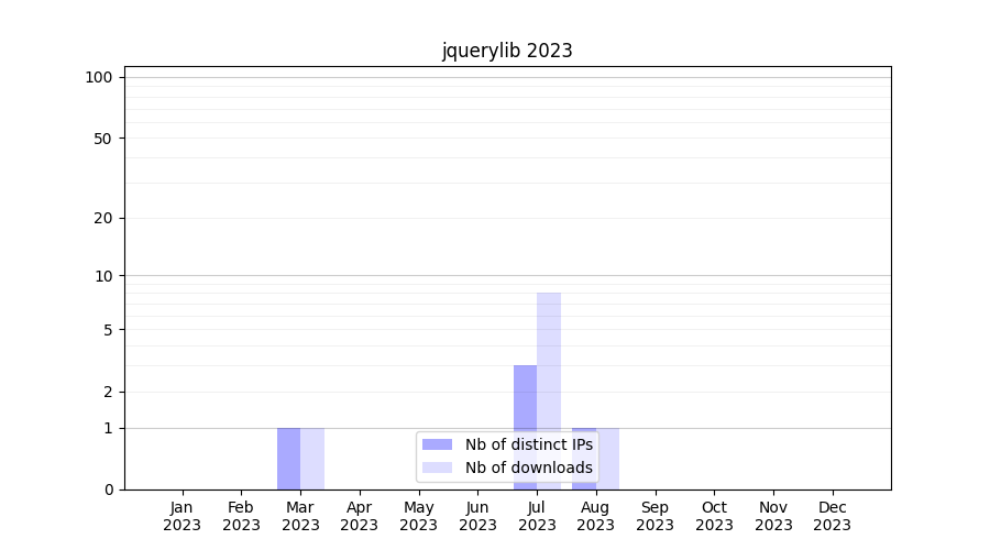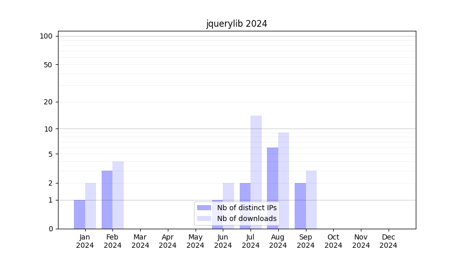Number of downloads for workflow package jquerylib, year by year, from 2025 back to 2015 (years with no downloads are omitted):