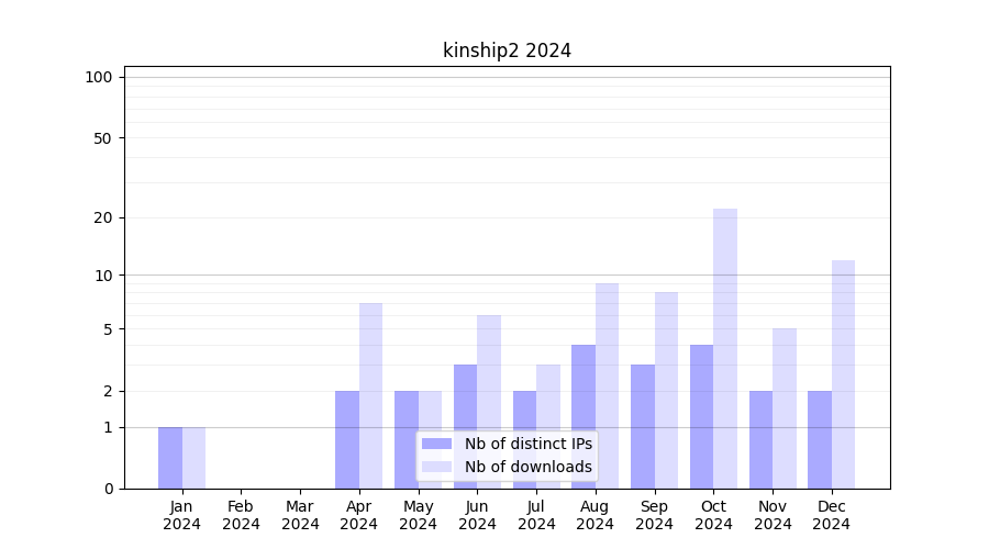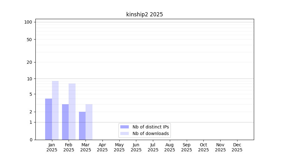 Number of downloads for workflow package kinship2, year by year, from 2025 back to 2015 (years with no downloads are omitted):