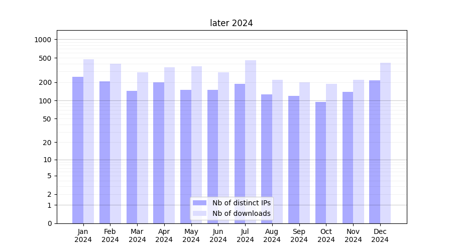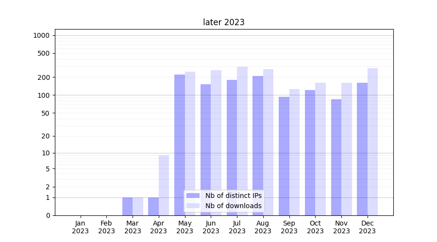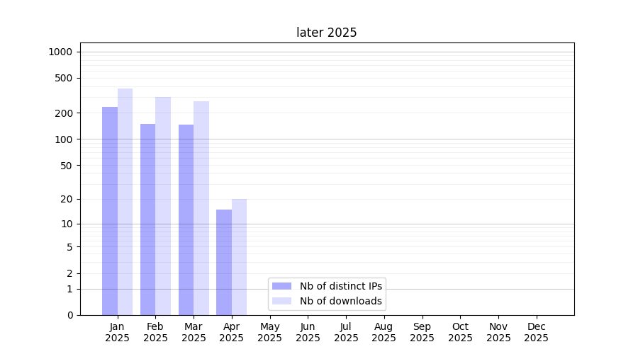 Number of downloads for workflow package later, year by year, from 2025 back to 2015 (years with no downloads are omitted):