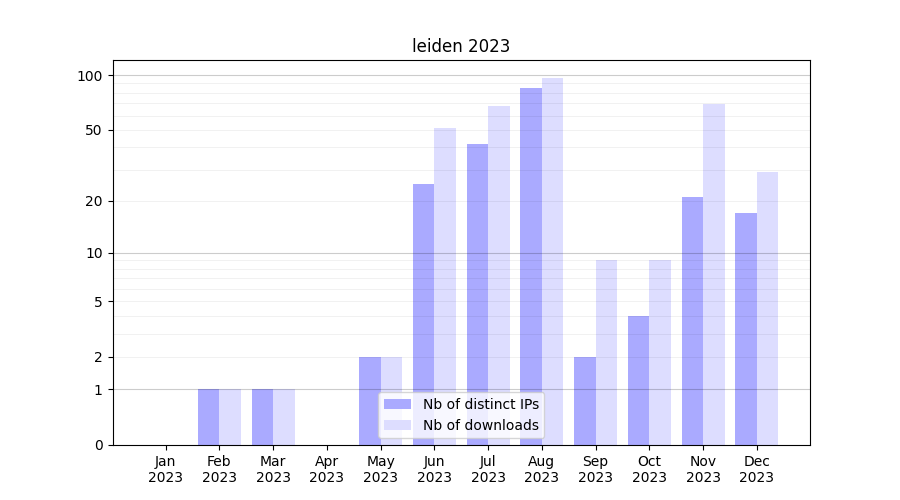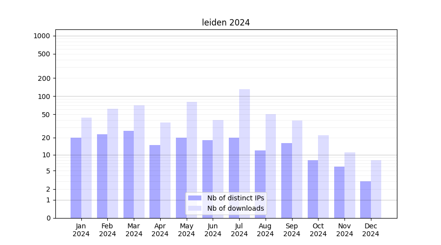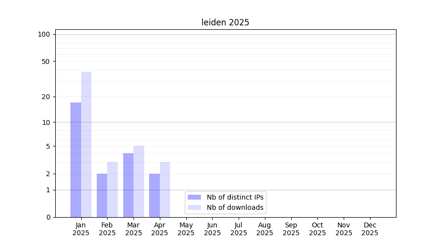Number of downloads for workflow package leiden, year by year, from 2025 back to 2015 (years with no downloads are omitted):