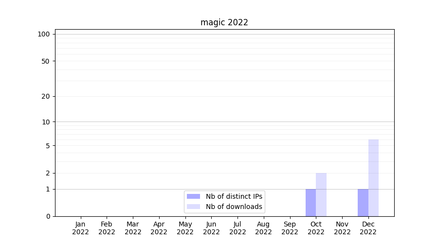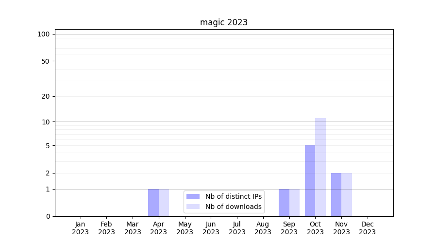 Number of downloads for workflow package magic, year by year, from 2025 back to 2015 (years with no downloads are omitted):