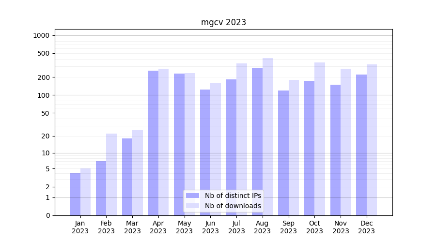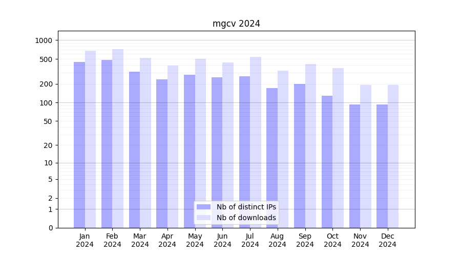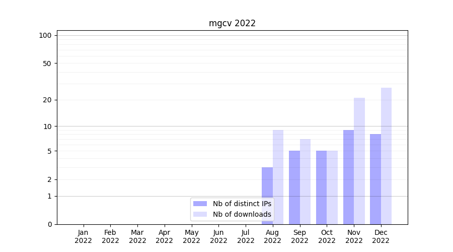 Number of downloads for workflow package mgcv, year by year, from 2025 back to 2015 (years with no downloads are omitted):