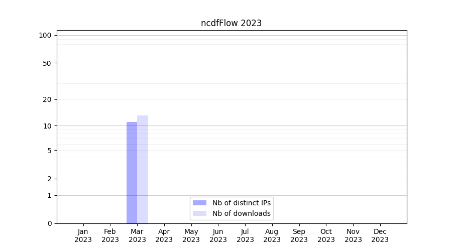 Number of downloads for workflow package ncdfFlow, year by year, from 2025 back to 2015 (years with no downloads are omitted):