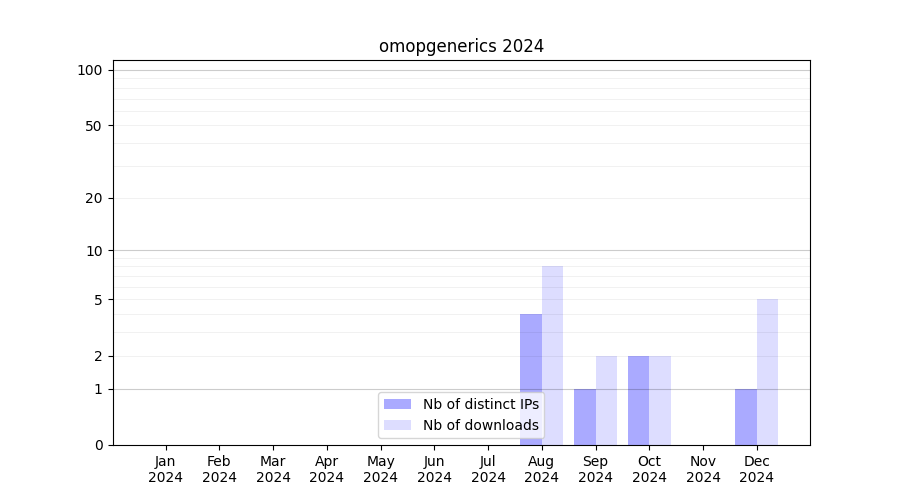 Number of downloads for workflow package omopgenerics, year by year, from 2025 back to 2015 (years with no downloads are omitted):
