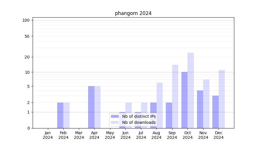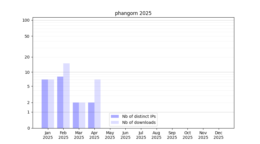 Number of downloads for workflow package phangorn, year by year, from 2025 back to 2015 (years with no downloads are omitted):