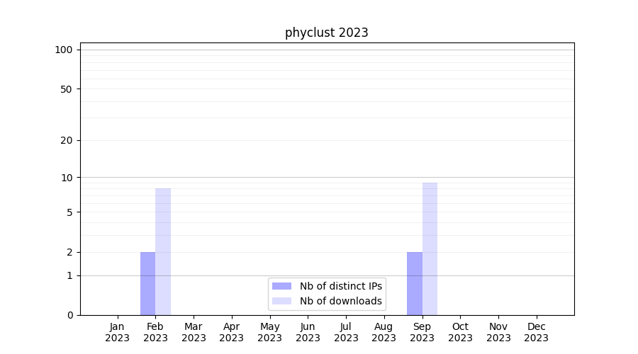 Number of downloads for workflow package phyclust, year by year, from 2025 back to 2015 (years with no downloads are omitted):