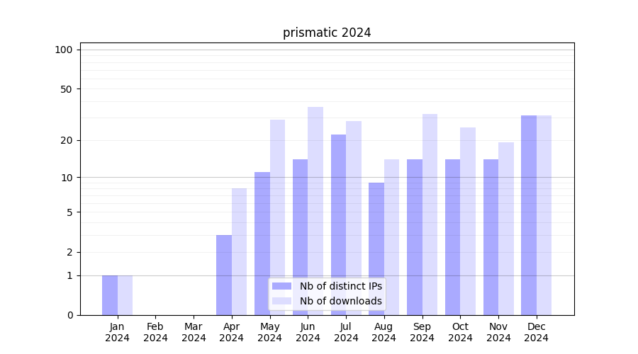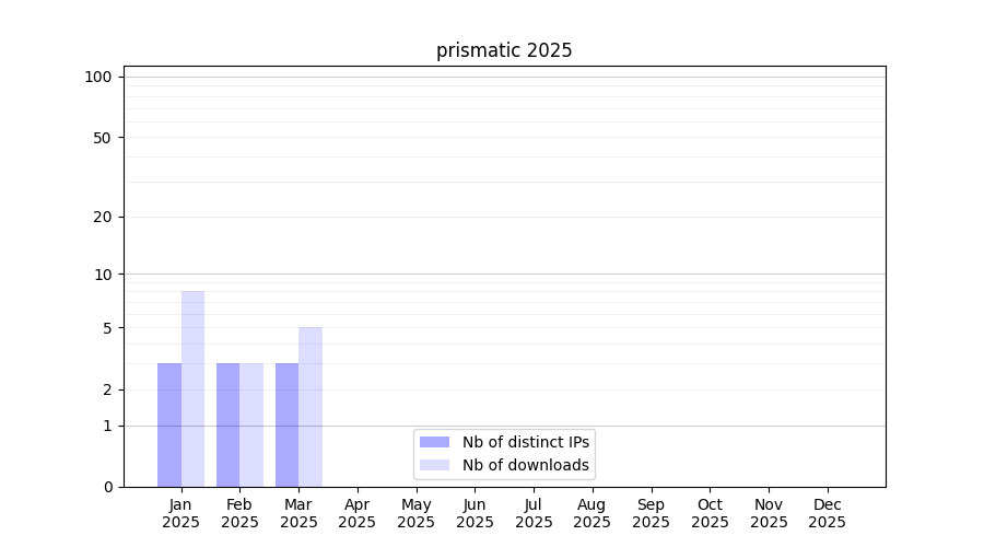 Number of downloads for workflow package prismatic, year by year, from 2025 back to 2015 (years with no downloads are omitted):