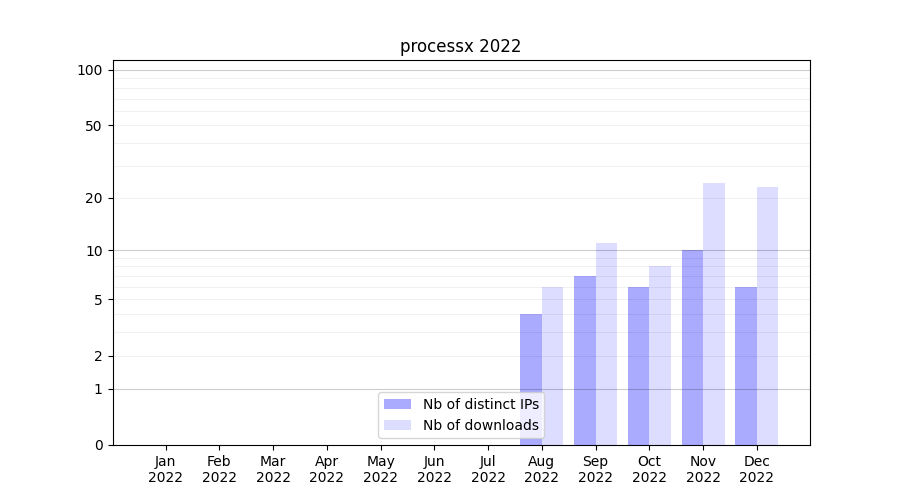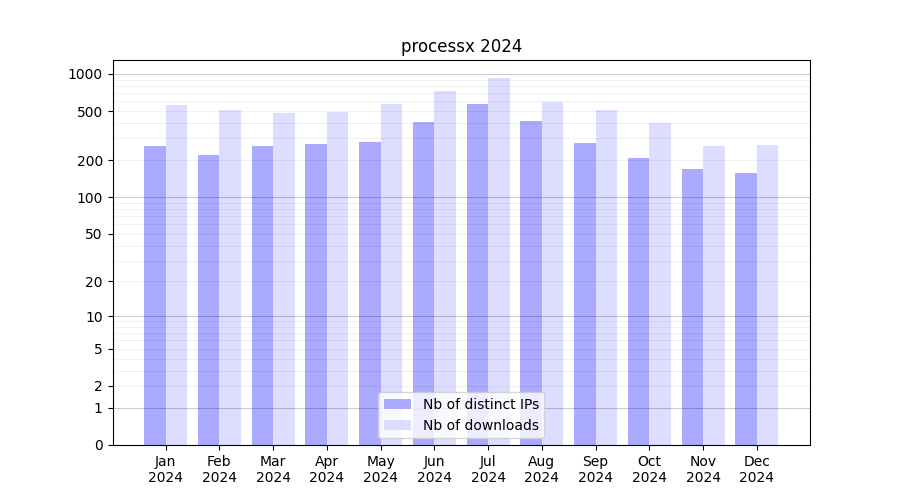 Number of downloads for workflow package processx, year by year, from 2025 back to 2015 (years with no downloads are omitted):