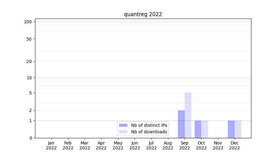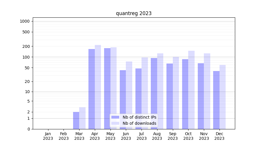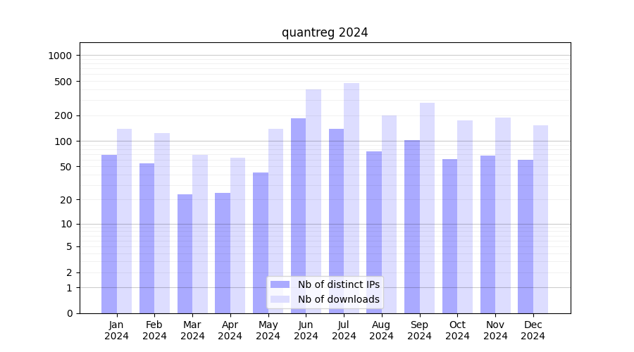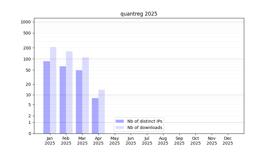 Number of downloads for workflow package quantreg, year by year, from 2025 back to 2015 (years with no downloads are omitted):