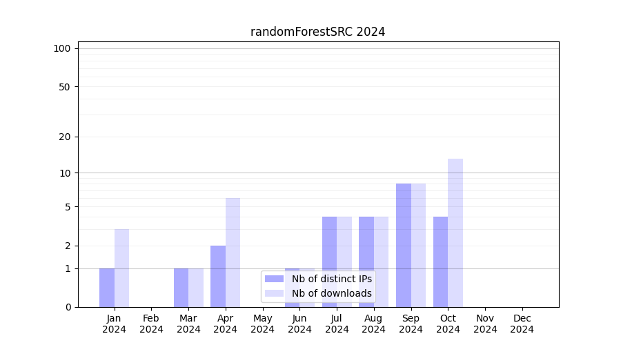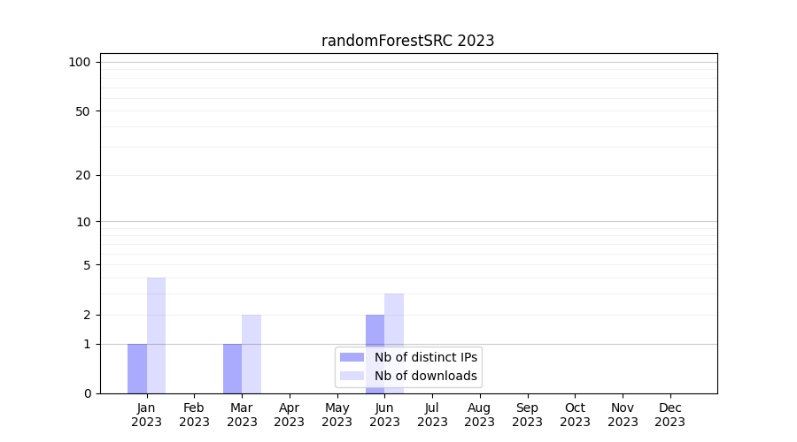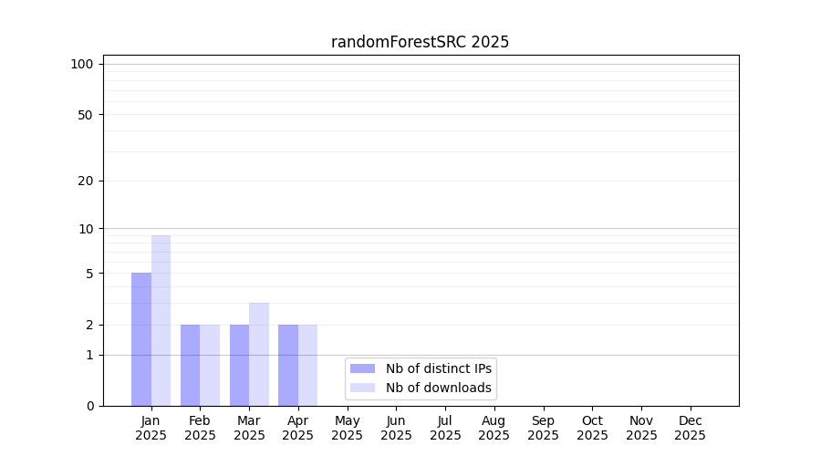 Number of downloads for workflow package randomForestSRC, year by year, from 2025 back to 2015 (years with no downloads are omitted):