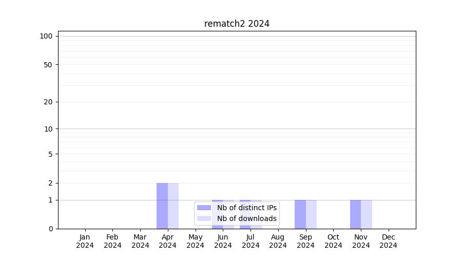 Number of downloads for workflow package rematch2, year by year, from 2025 back to 2015 (years with no downloads are omitted):