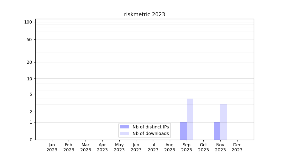 Number of downloads for workflow package riskmetric, year by year, from 2025 back to 2015 (years with no downloads are omitted):