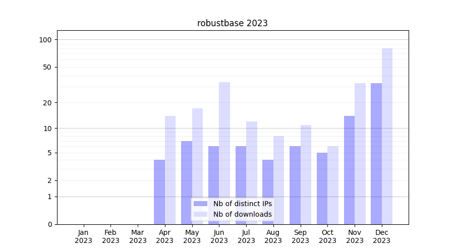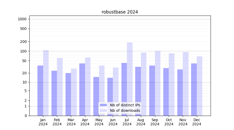 Number of downloads for workflow package robustbase, year by year, from 2025 back to 2015 (years with no downloads are omitted):