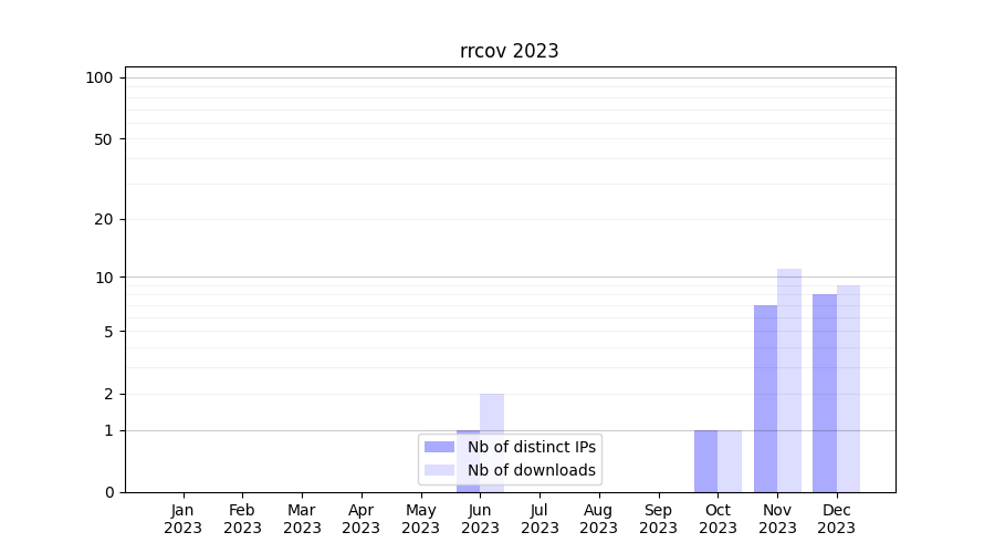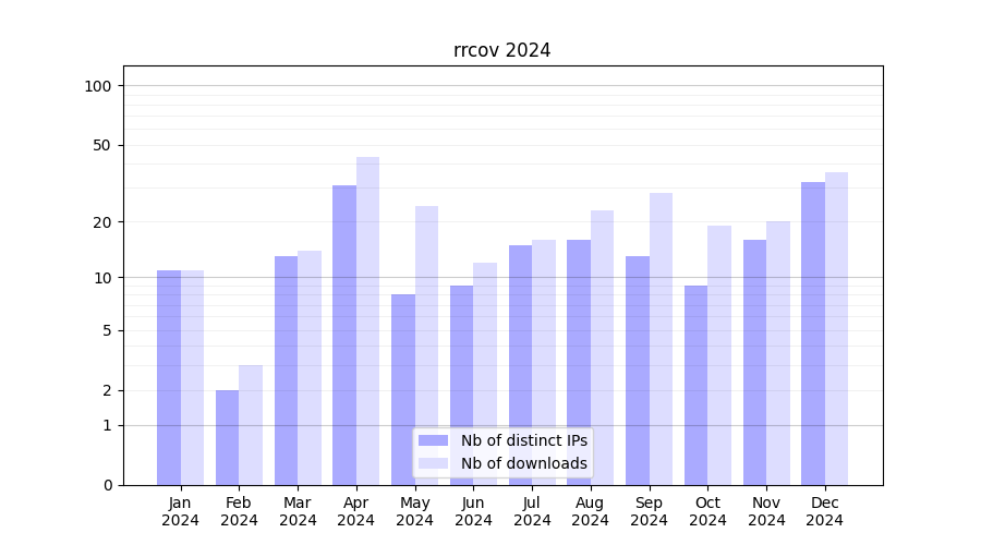 Number of downloads for workflow package rrcov, year by year, from 2025 back to 2015 (years with no downloads are omitted):