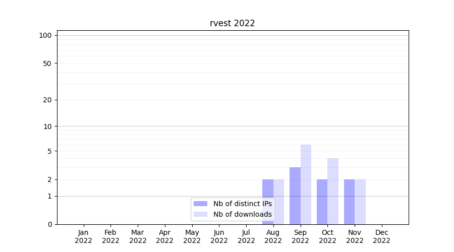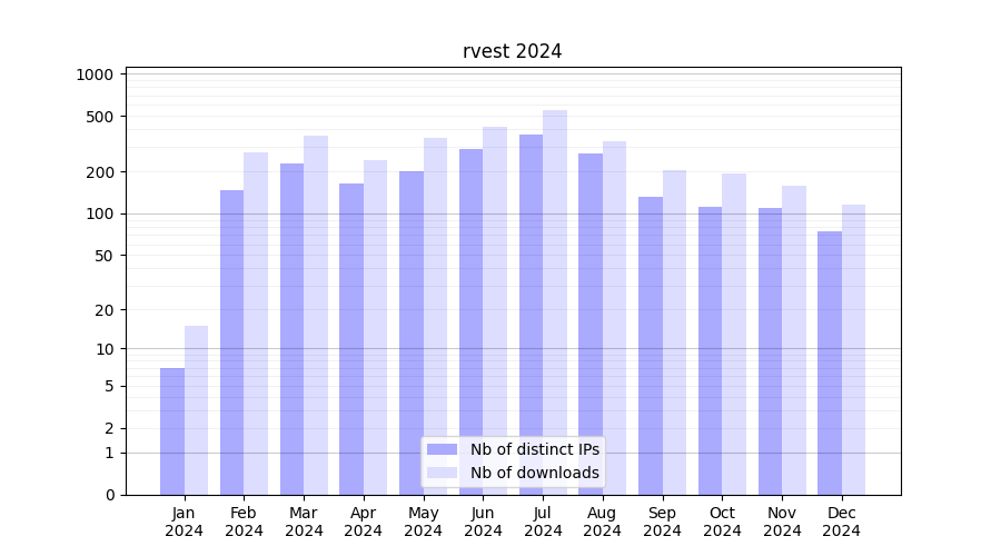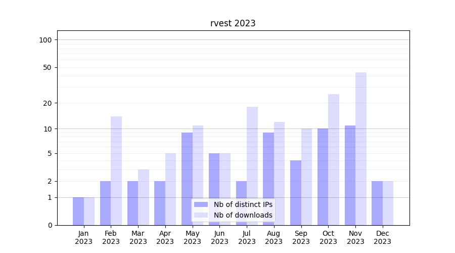 Number of downloads for workflow package rvest, year by year, from 2025 back to 2015 (years with no downloads are omitted):