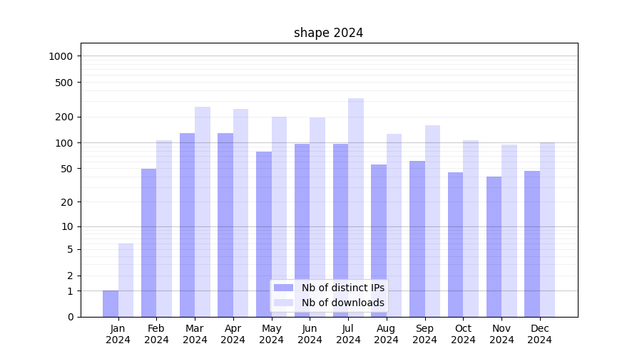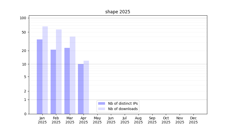 Number of downloads for workflow package shape, year by year, from 2025 back to 2015 (years with no downloads are omitted):