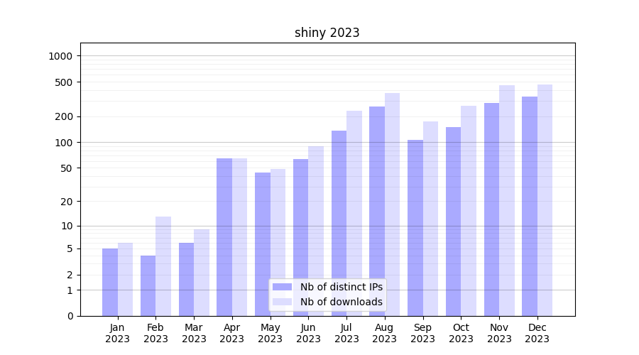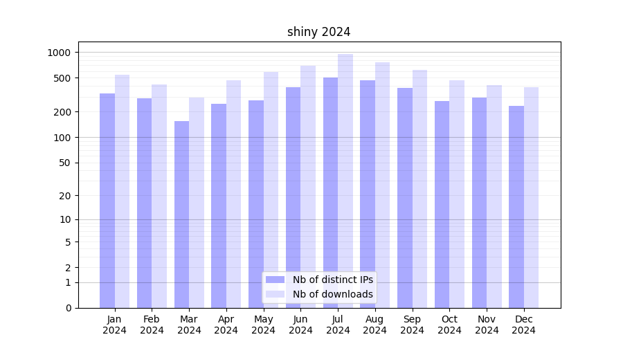 Number of downloads for workflow package shiny, year by year, from 2025 back to 2015 (years with no downloads are omitted):