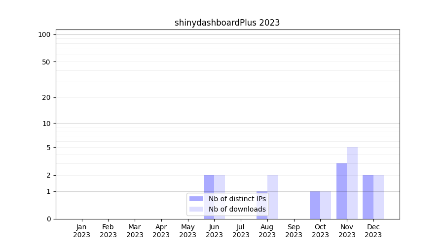 Number of downloads for workflow package shinydashboardPlus, year by year, from 2025 back to 2015 (years with no downloads are omitted):