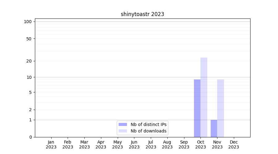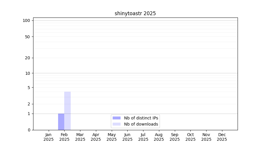 Number of downloads for workflow package shinytoastr, year by year, from 2025 back to 2015 (years with no downloads are omitted):