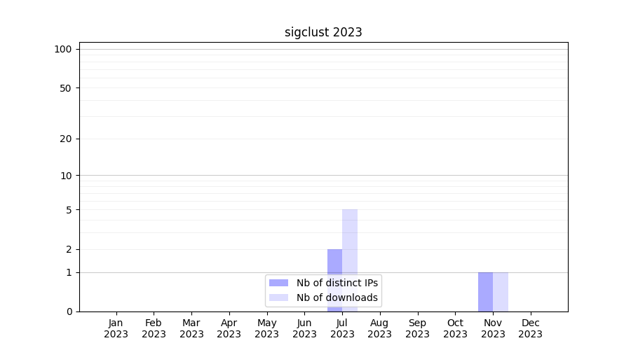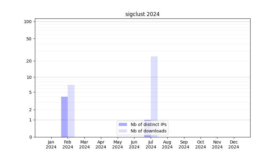 Number of downloads for workflow package sigclust, year by year, from 2025 back to 2015 (years with no downloads are omitted):